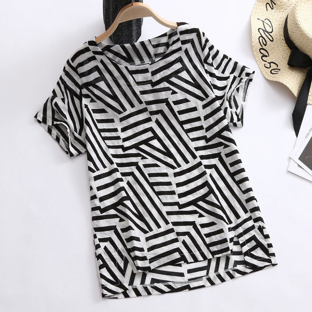 Explosive Retro Geometric Cotton and Linen Loose New Round Neck T-Shirt